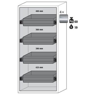 Veiligheidskast S-CLASSIC-90 S90.196.090 lichtgrijs_Asecos, Totale hoogte: 1968 mm, Totale breedte: 896 mm, Totale hoogte (Reeks): Hoog (1500 - 2300 mm), Totale breedte (Reeks): 800 mm, Aantal legborden: 0, Voor producten: Ontvlambare stoffen, Brandveilig: 90 min, Inhoud opvangbak: 0 L, Aantal vakken: 1, Model: 4x lade (roestvrij staal), Aantal deuren: 2, Kleur ombouw: Lichtgrijs, Kleur deur: Lichtgrijs, Totale diepte: 616 mm, Nuttige breedte: 750 mm, Nuttige diepte: 524 mm, Nuttige hoogte: 1742 mm, Max. belasting: 600 kg, Materiaal: Staal, Gewicht: 406.608 kg, RAL: 7035, Special Covid-19: nee, CLP - Ontvlambare stoffen: ja