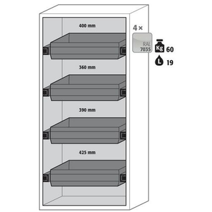 Veiligheidskast S-PHOENIX-90 S90.196.090_Asecos, Totale hoogte: 1968 mm, Totale breedte: 896 mm, Totale hoogte (Reeks): Hoog (1500 - 2300 mm), Totale breedte (Reeks): 800 mm, Aantal legborden: 0, Voor producten: Ontvlambare stoffen, Brandveilig: 90 min, Inhoud opvangbak: 0 L, Aantal vakken: 1, Model: 4x lade (plaatstaal met epoxy-coating), Aantal deuren: 2, Kleur ombouw: Lichtgrijs, Kleur deur: Lichtgrijs, Totale diepte: 616 mm, Nuttige breedte: 750 mm, Nuttige diepte: 524 mm, Nuttige hoogte: 1742 mm, Gewicht: 410.608 kg, RAL: 7035, Special Covid-19: nee