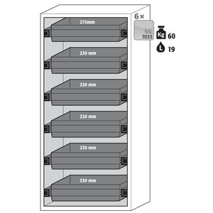 Veiligheidskast S-PHOENIX-90 S90.196.090_Asecos, Totale hoogte: 1968 mm, Totale breedte: 896 mm, Totale hoogte (Reeks): Hoog (1500 - 2300 mm), Totale breedte (Reeks): 800 mm, Aantal legborden: 0, Voor producten: Ontvlambare stoffen, Brandveilig: 90 min, Inhoud opvangbak: 0 L, Aantal vakken: 1, Model: 6x lade (plaatstaal met epoxy-coating), Aantal deuren: 2, Kleur ombouw: Lichtgrijs, Kleur deur: Lichtgrijs, Totale diepte: 616 mm, Nuttige breedte: 750 mm, Nuttige diepte: 524 mm, Nuttige hoogte: 1742 mm, Gewicht: 437.608 kg, RAL: 7035, Special Covid-19: nee