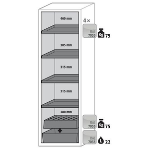 Veilige opslag, voldoet aan de geldende regelgeving voor gevaarlijke, ontvlambare producten in werkruimtes Robuust en duurzaam: Stevige constructie aan de buitenzijde van brandwerende platen met een coating van melaminehars 3 bevestigingsscharnieren per deur volledig sluitmechanisme en beveiligingselementen ter bescherming tegen corrosie, gemonteerd buiten de opslagruimte hoogwaardige deur, krasbestendig, met gestructureerd oppervlak met epoxy-coating Ergonomisch: de deur blijft in de stand staan bij het openen, automatische sluiting in geval van brand Gecontroleerd gebruik: vergrendelbare deur, compatibel met centrale vergrendeling Eenvoudig transport: geïntegreerde transportsokkel, eenvoudig afgewerkte plint of plint met 4 nivelleringsvoeten optioneel beschikbaar Beluchting en ontluchting: ingebouwd beluchtings- en ventilatiesysteem voor aansluiting (diameter 75 mm) op een technisch luchtafvoersysteem Getest en gecertificeerd conform de Amerikaanse norm FM 6050 Let op: voor de technische ventilatie van de kast adviseren wij de ventilatiebox met geïntegreerde filtratie (zonder gaten in de muren te boren of afvoerleidingen naar buiten).
