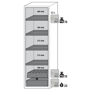 Veilige opslag, voldoet aan de geldende regelgeving voor gevaarlijke, ontvlambare producten in werkruimtes Robuust en duurzaam: Stevige constructie aan de buitenzijde van brandwerende platen met een coating van melaminehars 3 bevestigingsscharnieren per deur volledig sluitmechanisme en beveiligingselementen ter bescherming tegen corrosie, gemonteerd buiten de opslagruimte hoogwaardige deur, krasbestendig, met gestructureerd oppervlak met epoxy-coating Ergonomisch: de deur blijft in de stand staan bij het openen, automatische sluiting in geval van brand Gecontroleerd gebruik: vergrendelbare deur, compatibel met centrale vergrendeling Eenvoudig transport: geïntegreerde transportsokkel, eenvoudig afgewerkte plint of plint met 4 nivelleringsvoeten optioneel beschikbaar Beluchting en ontluchting: ingebouwd beluchtings- en ventilatiesysteem voor aansluiting (diameter 75 mm) op een technisch luchtafvoersysteem Getest en gecertificeerd conform de Amerikaanse norm FM 6050
