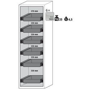 Veiligheidskast S-CLASSIC-90, Totale hoogte: 1968 mm, Totale breedte: 596 mm, Totale hoogte (Reeks): Hoog (1500 - 2300 mm), Totale breedte (Reeks): 500 - 800 mm, Aantal legborden: 0, Voor producten: Ontvlambare stoffen, Brandveilig: 90 min, Inhoud opvangbak: 0 L, Aantal vakken: 1, Model: 6x lade (plaatstaal met epoxy-coating), Aantal deuren: 1, Kleur ombouw: Wit, Kleur deur: Wit, Totale diepte: 616 mm, Nuttige breedte: 450 m, Nuttige diepte: 524 mm, Nuttige hoogte: 1742 mm, Gewicht: 315.165 kg, RAL: 9016, Special Covid-19: nee