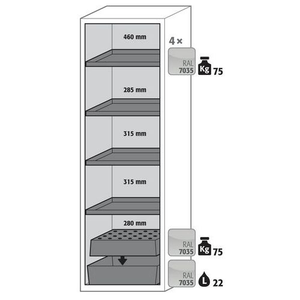 Veilige opslag van ontvlambare gevaarlijke stoffen in werkruimtes conform de wettelijke voorschriften, Functie - constructie: Robuust en duurzaam: stabiele buitenbehuizing van gepoedercoat fijn plaatstaal, 3-voudige deurophanging, volledig sluitmechaniek en veiligheidselementen ter bescherming tegen corrosie buiten de opslagruimte gemonteerd, Ruimtebesparende vouwdeur: kleine benodigde ruimte voor de kast bij geopende deur, Betrouwbaar en veilig: de deur klikt vast in de standaard gemonteerde deurvastzetinrichting voor het veilig plaatsen en uitnemen van emballage, Geen toegang voor onbevoegden: deur afsluitbaar met profielcilinder (geschikt voor centraal deursluitsysteem), Gemakkelijk te plaatsen: stelvoeten voor het compenseren van kleinere oneffenheden in de vloer (tot 10 mm), Be- en ontluchting: geïntegreerd beluchtings- en ventilatiesysteem voor aansluiting (NW 75) op een mechanische afzuiginstallatie
