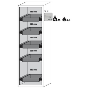 Veilige opslag van ontvlambare gevaarlijke stoffen in werkruimtes conform de wettelijke voorschriften, Functie - constructie: Robuust en duurzaam: stabiele buitenbehuizing van gepoedercoat fijn plaatstaal, 3-voudige deurophanging, volledig sluitmechaniek en veiligheidselementen ter bescherming tegen corrosie buiten de opslagruimte gemonteerd, Ruimtebesparende vouwdeur: kleine benodigde ruimte voor de kast bij geopende deur, Betrouwbaar en veilig: de deur klikt vast in de standaard gemonteerde deurvastzetinrichting voor het veilig plaatsen en uitnemen van emballage, Geen toegang voor onbevoegden: deur afsluitbaar met profielcilinder (geschikt voor centraal deursluitsysteem), Gemakkelijk te plaatsen: stelvoeten voor het compenseren van kleinere oneffenheden in de vloer (tot 10 mm), Be- en ontluchting: geïntegreerd beluchtings- en ventilatiesysteem voor aansluiting (NW 75) op een mechanische afzuiginstallatie
