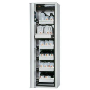 Veilige opslag van ontvlambare gevaarlijke stoffen in werkruimtes conform de wettelijke voorschriften, Functie - constructie: Robuust en duurzaam: stabiele buitenbehuizing van gepoedercoat fijn plaatstaal, 3-voudige deurophanging, volledig sluitmechaniek en veiligheidselementen ter bescherming tegen corrosie buiten de opslagruimte gemonteerd, Ruimtebesparende vouwdeur: kleine benodigde ruimte voor de kast bij geopende deur, Betrouwbaar en veilig: de deur klikt vast in de standaard gemonteerde deurvastzetinrichting voor het veilig plaatsen en uitnemen van emballage, Geen toegang voor onbevoegden: deur afsluitbaar met profielcilinder (geschikt voor centraal deursluitsysteem), Gemakkelijk te plaatsen: stelvoeten voor het compenseren van kleinere oneffenheden in de vloer (tot 10 mm), Be- en ontluchting: geïntegreerd beluchtings- en ventilatiesysteem voor aansluiting (NW 75) op een mechanische afzuiginstallatie