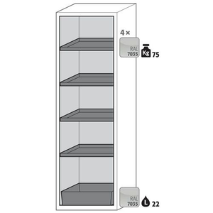 Brandveiligheidsopslagkast S-PHOENIX-90-S90.196.060, Totale hoogte: 1968 mm, Totale breedte: 596 mm, Totale hoogte (Reeks): Hoog (1500 - 2300 mm), Totale breedte (Reeks): 500 - 800 mm, Aantal legborden: 0, Voor producten: Ontvlambare stoffen, Brandveilig: 90 min, Inhoud opvangbak: 22 L, Aantal vakken: 1, Model: S90.196.060.FDACR, Aantal deuren: 1, Kleur ombouw: Lichtgrijs, Kleur deur: Lichtgrijs, Totale diepte: 616 mm, Nuttige breedte: 450 mm, Nuttige diepte: 524 mm, Nuttige hoogte: 1742 mm, Max. belasting: 600 kg, Materiaal: Staal, Gewicht: 260 kg, RAL: 7035, Special Covid-19: nee, CLP - Ontvlambare stoffen: ja