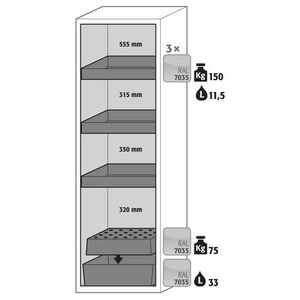 Veilige opslag van ontvlambare gevaarlijke stoffen in werkruimtes conform de wettelijke voorschriften, Functie - constructie: Robuust en duurzaam: stabiele buitenbehuizing van gepoedercoat fijn plaatstaal, 3-voudige deurophanging, volledig sluitmechaniek en veiligheidselementen ter bescherming tegen corrosie buiten de opslagruimte gemonteerd, Ruimtebesparende vouwdeur: kleine benodigde ruimte voor de kast bij geopende deur, Betrouwbaar en veilig: de deur klikt vast in de standaard gemonteerde deurvastzetinrichting voor het veilig plaatsen en uitnemen van emballage, Geen toegang voor onbevoegden: deur afsluitbaar met profielcilinder (geschikt voor centraal deursluitsysteem), Gemakkelijk te plaatsen: stelvoeten voor het compenseren van kleinere oneffenheden in de vloer (tot 10 mm), Be- en ontluchting: geïntegreerd beluchtings- en ventilatiesysteem voor aansluiting (NW 75) op een mechanische afzuiginstallatie