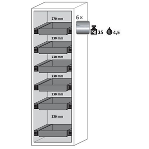 Veilige opslag van ontvlambare gevaarlijke stoffen in werkruimtes conform de wettelijke voorschriften, Functie - constructie: Robuust en duurzaam: stabiele buitenbehuizing van gepoedercoat fijn plaatstaal, 3-voudige deurophanging, volledig sluitmechaniek en veiligheidselementen ter bescherming tegen corrosie buiten de opslagruimte gemonteerd, Ruimtebesparende vouwdeur: kleine benodigde ruimte voor de kast bij geopende deur, Betrouwbaar en veilig: de deur klikt vast in de standaard gemonteerde deurvastzetinrichting voor het veilig plaatsen en uitnemen van emballage, Geen toegang voor onbevoegden: deur afsluitbaar met profielcilinder (geschikt voor centraal deursluitsysteem), Gemakkelijk te plaatsen: stelvoeten voor het compenseren van kleinere oneffenheden in de vloer (tot 10 mm), Be- en ontluchting: geïntegreerd beluchtings- en ventilatiesysteem voor aansluiting (NW 75) op een mechanische afzuiginstallatie