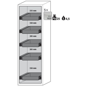Brandveiligheidsopslagkast S-PHOENIX-90-S90.196.060, Totale hoogte: 1968 mm, Totale breedte: 1196 mm, Totale hoogte (Reeks): Hoog (1500 - 2300 mm), Totale breedte (Reeks): 800 mm, Aantal legborden: 3, Voor producten: Ontvlambare stoffen, Brandveilig: 90 min, Inhoud opvangbak: 33 L, Aantal vakken: 1, Model: S90.196.120.FDAO, Aantal deuren: 2, Kleur ombouw: Lichtgrijs, Kleur deur: Lichtgrijs, Totale diepte: 616 mm, Nuttige breedte: 1050 mm, Nuttige diepte: 524 mm, Nuttige hoogte: 1742 mm, Max. belasting: 600 kg, Materiaal: Staal, Gewicht: 420 kg, RAL: 7035, Special Covid-19: nee, CLP - Ontvlambare stoffen: ja
