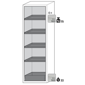 Veiligheidskast S-PHOENIX touchless-90_Asecos, Totale hoogte: 1968 mm, Totale breedte: 596 mm, Totale hoogte (Reeks): Hoog (1500 - 2300 mm), Totale breedte (Reeks): 500 - 800 mm, Aantal legborden: 4, Voor producten: Ontvlambare stoffen, Brandveilig: 90 min, Inhoud opvangbak: 22 L, Aantal vakken: 1, Model: 4x legbord, 1x opvangbak op de vloer (plaatstaal met epoxy-coating), Aantal deuren: 1, Kleur ombouw: Lichtgrijs, Kleur deur: Lichtgrijs, Totale diepte: 616 mm, Nuttige breedte: 450 mm, Nuttige diepte: 524 mm, Nuttige hoogte: 1742 mm, Materiaal: Staal, Gewicht: 306.665 kg, RAL: 7035, Special Covid-19: nee