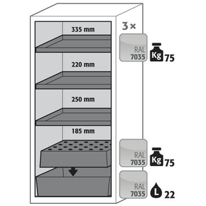 Veilige opslag, voldoet aan de geldende regelgeving voor gevaarlijke, ontvlambare producten in werkruimtes Robuust en duurzaam: Stevige constructie aan de buitenzijde van brandwerende platen met een coating van melaminehars 3 bevestigingsscharnieren per deur volledig sluitmechanisme en beveiligingselementen ter bescherming tegen corrosie, gemonteerd buiten de opslagruimte hoogwaardige deur, krasbestendig, met gestructureerd oppervlak met epoxy-coating Ergonomisch: de deur blijft in de stand staan bij het openen, automatische sluiting in geval van brand Gecontroleerd gebruik: vergrendelbare deur, compatibel met centrale vergrendeling Eenvoudig transport: geïntegreerde transportsokkel, eenvoudig afgewerkte plint of plint met 4 nivelleringsvoeten optioneel beschikbaar Beluchting en ontluchting: ingebouwd beluchtings- en ventilatiesysteem voor aansluiting (diameter 75 mm) op een technisch luchtafvoersysteem Getest en gecertificeerd conform de Amerikaanse norm FM 6050