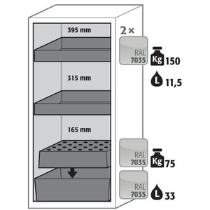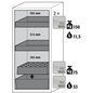 Veilige opslag, voldoet aan de geldende regelgeving voor gevaarlijke, ontvlambare producten in werkruimtes Robuust en duurzaam: Stevige constructie aan de buitenzijde van brandwerende platen met een coating van melaminehars 3 bevestigingsscharnieren per deur volledig sluitmechanisme en beveiligingselementen ter bescherming tegen corrosie, gemonteerd buiten de opslagruimte hoogwaardige deur, krasbestendig, met gestructureerd oppervlak met epoxy-coating Ergonomisch: de deur blijft in de stand staan bij het openen, automatische sluiting in geval van brand Gecontroleerd gebruik: vergrendelbare deur, compatibel met centrale vergrendeling Eenvoudig transport: geïntegreerde transportsokkel, eenvoudig afgewerkte plint of plint met 4 nivelleringsvoeten optioneel beschikbaar Beluchting en ontluchting: ingebouwd beluchtings- en ventilatiesysteem voor aansluiting (diameter 75 mm) op een technisch luchtafvoersysteem Getest en gecertificeerd conform de Amerikaanse norm FM 6050