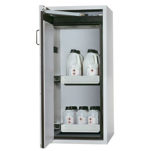 Veilige opslag, voldoet aan de geldende regelgeving voor gevaarlijke, ontvlambare producten in werkruimtes Robuust en duurzaam: Stevige constructie aan de buitenzijde van brandwerende platen met een coating van melaminehars 3 bevestigingsscharnieren per deur volledig sluitmechanisme en beveiligingselementen ter bescherming tegen corrosie, gemonteerd buiten de opslagruimte hoogwaardige deur, krasbestendig, met gestructureerd oppervlak met epoxy-coating Ergonomisch: de deur blijft in de stand staan bij het openen, automatische sluiting in geval van brand Gecontroleerd gebruik: vergrendelbare deur, compatibel met centrale vergrendeling Eenvoudig transport: geïntegreerde transportsokkel, eenvoudig afgewerkte plint of plint met 4 nivelleringsvoeten optioneel beschikbaar Beluchting en ontluchting: ingebouwd beluchtings- en ventilatiesysteem voor aansluiting (diameter 75 mm) op een technisch luchtafvoersysteem Getest en gecertificeerd conform de Amerikaanse norm FM 6050