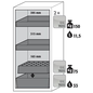 Veilige opslag, voldoet aan de geldende regelgeving voor gevaarlijke, ontvlambare producten in werkruimtes Functie/constructie: Robuust en duurzaam: stevige stalen constructie aan de buitenkant met epoxy-coating 3 bevestigingsscharnieren per deur, volledig sluitmechanisme en beveiligingselementen ter bescherming tegen corrosie, gemonteerd buiten de opslagruimte Comfortabel: automatisch deursluitsysteem, deuren kunnen in geopende stand worden gehouden. Veilige opslag van containers Altijd gesloten: automatisch deursluitsysteem (TSA) sluit de geblokkeerde deur na 60 seconde, geluidsalarm en visueel alarm voordat de deur sluit Gecontroleerd gebruik: vergrendelbare deur, compatibel met centrale vergrendeling Eenvoudige installatie: geïntegreerde verstelbare poten Beluchting en ontluchting: ingebouwd beluchtings- en ventilatiesysteem voor aansluiting (diameter 75 mm) op een technisch luchtafvoersysteem Let op: voor de technische ventilatie van de kast adviseren wij de ventilatiebox met geïntegreerde filtratie (zonder gaten in de muren te boren of afvoerleidingen naar buiten).
