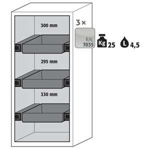 Veilige opslag, voldoet aan de geldende regelgeving voor gevaarlijke, ontvlambare producten in werkruimtes Functie/constructie: Robuust en duurzaam: stevige stalen constructie aan de buitenkant met epoxy-coating 3 bevestigingsscharnieren per deur, volledig sluitmechanisme en beveiligingselementen ter bescherming tegen corrosie, gemonteerd buiten de opslagruimte Comfortabel: automatisch deursluitsysteem, deuren kunnen in geopende stand worden gehouden. Veilige opslag van containers Altijd gesloten: automatisch deursluitsysteem (TSA) sluit de geblokkeerde deur na 60 seconde, geluidsalarm en visueel alarm voordat de deur sluit Gecontroleerd gebruik: vergrendelbare deur, compatibel met centrale vergrendeling Eenvoudige installatie: geïntegreerde verstelbare poten Beluchting en ontluchting: ingebouwd beluchtings- en ventilatiesysteem voor aansluiting (diameter 75 mm) op een technisch luchtafvoersysteem Let op: voor de technische ventilatie van de kast adviseren wij de ventilatiebox met geïntegreerde filtratie (zonder gaten in de muren te boren of afvoerleidingen naar buiten).