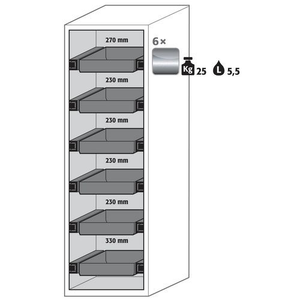 Veilige opslag van ontvlambare gevaarlijke stoffen in werkruimtes conform de wettelijke voorschriften, Functie - constructie: Robuust en duurzaam: stabiele buitenbehuizing van gepoedercoat fijn plaatstaal, 3-voudige deurophanging, volledig sluitmechaniek en veiligheidselementen ter bescherming tegen corrosie buiten de opslagruimte gemonteerd, Ruimtebesparende vouwdeur: kleine benodigde ruimte voor de kast bij geopende deur, Betrouwbaar en veilig: de deur klikt vast in de standaard gemonteerde deurvastzetinrichting voor het veilig plaatsen en uitnemen van emballage, Geen toegang voor onbevoegden: deur afsluitbaar met profielcilinder (geschikt voor centraal deursluitsysteem), Gemakkelijk te plaatsen: stelvoeten voor het compenseren van kleinere oneffenheden in de vloer (tot 10 mm), Be- en ontluchting: geïntegreerd beluchtings- en ventilatiesysteem voor aansluiting (NW 75) op een mechanische afzuiginstallatie Let op: voor de technische ventilatie van de kast adviseren wij de ventilatiebox met geïntegreerde filtratie (zonder gaten in de muren te boren of afvoerleidingen naar buiten).