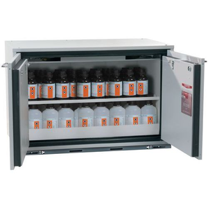 Veilige opslag, voldoet aan de geldende regelgeving voor gevaarlijke, ontvlambare producten in werkruimtes Functie / constructie: Robuust en duurzaam: stalen constructie aan de buitenkant met epoxy-coating Werkcomfort: de deuren zijn in alle posities geblokkeerd, veilige toegang tot alle containers – openingshoek van de deuren 93°, binnenkant van de kast is volledig zichtbaar Gecontroleerd gebruik: vergrendelbare deuren slot, indicator voor deurvergrendeling (rood/groen) Mobiel: optionele sokkel met wielen, voor eenvoudig verplaatsen van de kast Beluchting en ontluchting: ingebouwd beluchtings- en ventilatiesysteem voor aansluiting (diameter 50 mm) op een technisch luchtafvoersysteem