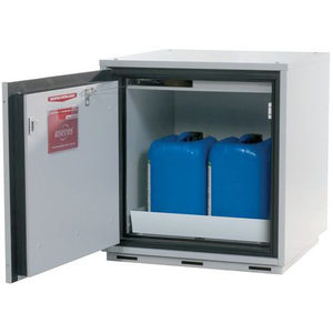 Veilige opslag, voldoet aan de geldende regelgeving voor gevaarlijke, ontvlambare producten in werkruimtes Functie / constructie: Robuust en duurzaam: stalen constructie aan de buitenkant met epoxy-coating Werkcomfort: de deuren zijn in alle posities geblokkeerd, veilige toegang tot alle containers – openingshoek van de deuren 93°, binnenkant van de kast is volledig zichtbaar Gecontroleerd gebruik: vergrendelbare deuren slot, indicator voor deurvergrendeling (rood/groen) Mobiel: optionele sokkel met wielen, voor eenvoudig verplaatsen van de kast Beluchting en ontluchting: ingebouwd beluchtings- en ventilatiesysteem voor aansluiting (diameter 50 mm) op een technisch luchtafvoersysteem