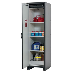 Veiligheidskast Q-CLASSIC-30 Q30.195.056 grijs/blauw_Asecos, Totale hoogte: 1947 mm, Totale breedte: 564 mm, Totale hoogte (Reeks): Hoog (1500 - 2300 mm), Totale breedte (Reeks): 500 - 800 mm, Aantal legborden: 3, Voor producten: Ontvlambare stoffen, Brandveilig: 30 min, Inhoud opvangbak: 22 L, Aantal vakken: 1, Model: 3x legbord, 1x rooster, 1x opvangbak op de vloer (plaatstaal met epoxy-coating), Aantal deuren: 1, Kleur ombouw: Antraciet, Kleur deur: Blauw, Totale diepte: 620 mm, Nuttige breedte: 450 mm, Nuttige diepte: 519 mm, Nuttige hoogte: 1626 mm, Materiaal: Staal, Gewicht: 186.528 kg, Special Covid-19: nee
