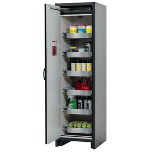 Veilige opslag, voldoet aan de geldende regelgeving voor gevaarlijke, ontvlambare producten in werkruimtes Robuust en duurzaam: Stevige constructie aan de buitenzijde van brandwerende platen met een coating van melaminehars 3 bevestigingsscharnieren per deur, volledig sluitmechanisme en beveiligingselementen ter bescherming tegen corrosie, gemonteerd buiten de opslagruimte hoogwaardige deur, krasbestendig, met gestructureerd oppervlak met epoxy-coating Ergonomisch: de deur blijft in de stand staan bij het openen, automatische sluiting in geval van brand Gecontroleerd gebruik: vergrendelbare deur, compatibel met centrale vergrendeling Eenvoudig transport: geïntegreerde transportsokkel, eenvoudig afgewerkte plint of plint met 4 nivelleringsvoeten optioneel beschikbaar Beluchting en ontluchting: ingebouwd beluchtings- en ventilatiesysteem voor aansluiting (diameter 75 mm) op een technisch luchtafvoersysteem Getest en gecertificeerd conform de Amerikaanse norm FM 6050 Let op: wij raden aan om naast de kast ook de plint met verstelinrichting te bestellen. Hierdoor is het mogelijk om snel en veilig kleine oneffenheden in de vloer op te vangen, zodat de kast eenvoudig en zonder veel moeite kan worden versteld. Voor de technische ventilatie van de kast adviseren wij de ventilatiebox met geïntegreerde filtratie (zonder gaten in de muren te boren of afvoerleidingen naar buiten).