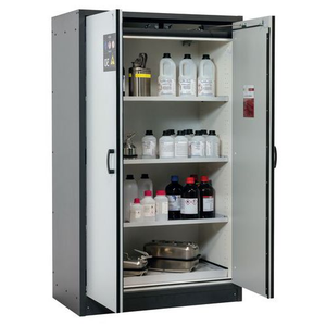 Veilige opslag, voldoet aan de geldende regelgeving voor gevaarlijke, ontvlambare producten in werkruimtes Robuust en duurzaam: Stevige constructie aan de buitenzijde van brandwerende platen met een coating van melaminehars 3 bevestigingsscharnieren per deur, volledig sluitmechanisme en beveiligingselementen ter bescherming tegen corrosie, gemonteerd buiten de opslagruimte hoogwaardige deur krasbestendig, met gestructureerd oppervlak met epoxy-coating Ergonomisch: de deur blijft in de stand staan bij het openen, automatische sluiting in geval van brand Gecontroleerd gebruik: vergrendelbare deur, compatibel met centrale vergrendeling Eenvoudig transport: geïntegreerde transportsokkel, eenvoudig afgewerkte plint of plint met 4 nivelleringsvoeten optioneel beschikbaar Beluchting en ontluchting: ingebouwd beluchtings- en ventilatiesysteem voor aansluiting (diameter 75 mm) op een technisch luchtafvoersysteem Getest en gecertificeerd conform de Amerikaanse norm FM 6050 Let op: wij raden aan om naast de kast ook de plint met verstelinrichting te bestellen. Hierdoor is het mogelijk om snel en veilig kleine oneffenheden in de vloer op te vangen, zodat de kast eenvoudig en zonder veel moeite kan worden versteld. Voor de technische ventilatie van de kast adviseren wij de ventilatiebox met geïntegreerde filtratie (zonder gaten in de muren te boren of afvoerleidingen naar buiten).