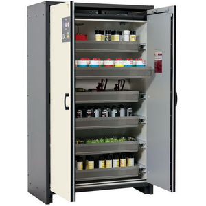 Veilige opslag, voldoet aan de geldende regelgeving voor gevaarlijke, ontvlambare producten in werkruimten Robuust en duurzaam: Stevige constructie aan de buitenzijde van brandwerende platen met een coating van melaminehars 3 bevestigingsscharnieren per deur, volledig sluitmechanisme en beveiligingselementen ter bescherming tegen corrosie, gemonteerd buiten de opslagruimte hoogwaardige deur, Krasbestendig, met gestructureerd oppervlak met epoxy-coating Ergonomisch: de deur blijft in de stand staan bij het openen, automatische sluiting in geval van brand Gecontroleerd gebruik: vergrendelbare deur, compatibel met centrale vergrendeling Eenvoudig transport: geïntegreerde transportsokkel, eenvoudig afgewerkte plint of plint met 4 nivelleringsvoeten optioneel beschikbaar Beluchting en ontluchting: ingebouwd beluchtings- en ventilatiesysteem voor aansluiting (diameter 75 mm) op een technisch luchtafvoersysteem Getest en gecertificeerd conform de Amerikaanse norm FM 6050 Let op: wij raden aan om naast de kast ook de plint met verstelinrichting te bestellen. Hierdoor is het mogelijk om snel en veilig kleine oneffenheden in de vloer op te vangen, zodat de kast eenvoudig en zonder veel moeite kan worden versteld. Voor de technische ventilatie van de kast adviseren wij de ventilatiebox met geïntegreerde filtratie (zonder gaten in de muren te boren of afvoerleidingen naar buiten).