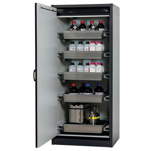 Veilige opslag, voldoet aan de geldende regelgeving voor gevaarlijke, ontvlambare producten in werkruimten Robuust en duurzaam: Stevige constructie aan de buitenzijde van brandwerende platen met een coating van melaminehars 3 bevestigingsscharnieren per deur, volledig sluitmechanisme en beveiligingselementen ter bescherming tegen corrosie, gemonteerd buiten de opslagruimte hoogwaardige deur, krasbestendig, met gestructureerd oppervlak met epoxy-coating Ergonomisch: de deur blijft in de stand staan bij het openen, automatische sluiting in geval van brand Gecontroleerd gebruik: vergrendelbare deur, compatibel met centrale vergrendeling Eenvoudig transport: geïntegreerde transportsokkel, eenvoudig afgewerkte plint of plint met 4 nivelleringsvoeten optioneel beschikbaar Beluchting en ontluchting: ingebouwd beluchtings- en ventilatiesysteem voor aansluiting (diameter 75 mm) op een technisch luchtafvoersysteem Getest en gecertificeerd conform de Amerikaanse norm FM 6050 Let op: wij raden aan om naast de kast ook de plint met verstelinrichting te bestellen. Hierdoor is het mogelijk om snel en veilig kleine oneffenheden in de vloer op te vangen, zodat de kast eenvoudig en zonder veel moeite kan worden versteld. Voor de technische ventilatie van de kast adviseren wij de ventilatiebox met geïntegreerde filtratie (zonder gaten in de muren te boren of afvoerleidingen naar buiten).