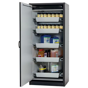Veilige opslag, voldoet aan de geldende regelgeving voor gevaarlijke, ontvlambare producten in werkruimtes Robuust en duurzaam: Stevige constructie aan de buitenzijde van brandwerende platen met een coating van melaminehars 3 bevestigingsscharnieren per deur, volledig sluitmechanisme en beveiligingselementen ter bescherming tegen corrosie, gemonteerd buiten de opslagruimte hoogwaardige deur, krasbestendig, met gestructureerd oppervlak met epoxy-coating Ergonomisch: de deur blijft in de stand staan bij het openen, automatische sluiting in geval van brand Gecontroleerd gebruik: vergrendelbare deur, compatibel met centrale vergrendeling Eenvoudig transport: geïntegreerde transportsokkel, eenvoudig afgewerkte plint of plint met 4 nivelleringsvoeten optioneel beschikbaar Beluchting en ontluchting: ingebouwd beluchtings- en ventilatiesysteem voor aansluiting (diameter 75 mm) op een technisch luchtafvoersysteem Getest en gecertificeerd conform de Amerikaanse norm FM 6050 Let op: wij raden aan om naast de kast ook de plint met verstelinrichting te bestellen. Hierdoor is het mogelijk om snel en veilig kleine oneffenheden in de vloer op te vangen, zodat de kast eenvoudig en zonder veel moeite kan worden versteld. Voor de technische ventilatie van de kast adviseren wij de ventilatiebox met geïntegreerde filtratie (zonder gaten in de muren te boren of afvoerleidingen naar buiten).
