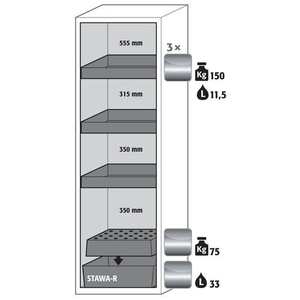 Veilige opslag, voldoet aan de geldende regelgeving voor gevaarlijke, ontvlambare producten in werkruimtes Robuust en duurzaam: Stevige constructie aan de buitenzijde van brandwerende platen met een coating van melaminehars 3 bevestigingsscharnieren per deur volledig sluitmechanisme en beveiligingselementen ter bescherming tegen corrosie, gemonteerd buiten de opslagruimte hoogwaardige deur, krasbestendig, met gestructureerd oppervlak met epoxy-coating Ergonomisch: de deur blijft in de stand staan bij het openen, automatische sluiting in geval van brand Gecontroleerd gebruik: vergrendelbare deur, compatibel met centrale vergrendeling Eenvoudig transport: geïntegreerde transportsokkel, eenvoudig afgewerkte plint of plint met 4 nivelleringsvoeten optioneel beschikbaar Beluchting en ontluchting: ingebouwd beluchtings- en ventilatiesysteem voor aansluiting (diameter 75 mm) op een technisch luchtafvoersysteem Getest en gecertificeerd conform de Amerikaanse norm FM 6050