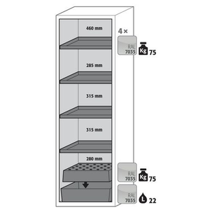Veiligheidskast S-CLASSIC-90, Totale hoogte: 1968 mm, Totale breedte: 596 mm, Totale hoogte (Reeks): Hoog (1500 - 2300 mm), Totale breedte (Reeks): 500 - 800 mm, Aantal legborden: 4, Voor producten: Ontvlambare stoffen, Brandveilig: 90 min, Inhoud opvangbak: 22 L, Aantal vakken: 1, Model: 4x legbord, 1x rooster, 1x opvangbak op de vloer (plaatstaal met epoxy-coating), Aantal deuren: 1, Kleur ombouw: Wit, Kleur deur: Wit, Totale diepte: 616 mm, Nuttige breedte: 450 m, Nuttige diepte: 524 mm, Nuttige hoogte: 1742 mm, Materiaal: Staal, Gewicht: 294.665 kg, RAL: 9016, Special Covid-19: nee