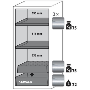 Veilige opslag, voldoet aan de geldende regelgeving voor gevaarlijke, ontvlambare producten in werkruimtes Robuust en duurzaam: Stevige constructie aan de buitenzijde van brandwerende platen met een coating van melaminehars 3 bevestigingsscharnieren per deur volledig sluitmechanisme en beveiligingselementen ter bescherming tegen corrosie, gemonteerd buiten de opslagruimte hoogwaardige deur, krasbestendig, met gestructureerd oppervlak met epoxy-coating Ergonomisch: de deur blijft in de stand staan bij het openen, automatische sluiting in geval van brand Gecontroleerd gebruik: vergrendelbare deur, compatibel met centrale vergrendeling Eenvoudig transport: geïntegreerde transportsokkel, eenvoudig afgewerkte plint of plint met 4 nivelleringsvoeten optioneel beschikbaar Beluchting en ontluchting: ingebouwd beluchtings- en ventilatiesysteem voor aansluiting (diameter 75 mm) op een technisch luchtafvoersysteem Getest en gecertificeerd conform de Amerikaanse norm FM 6050