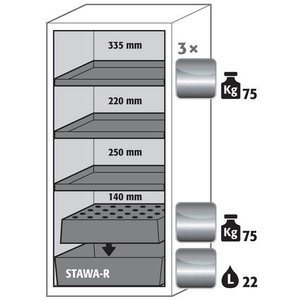 Veilige opslag, voldoet aan de geldende regelgeving voor gevaarlijke, ontvlambare producten in werkruimtes Robuust en duurzaam: Stevige constructie aan de buitenzijde van brandwerende platen met een coating van melaminehars 3 bevestigingsscharnieren per deur volledig sluitmechanisme en beveiligingselementen ter bescherming tegen corrosie, gemonteerd buiten de opslagruimte hoogwaardige deur, krasbestendig, met gestructureerd oppervlak met epoxy-coating Ergonomisch: de deur blijft in de stand staan bij het openen, automatische sluiting in geval van brand Gecontroleerd gebruik: vergrendelbare deur, compatibel met centrale vergrendeling Eenvoudig transport: geïntegreerde transportsokkel, eenvoudig afgewerkte plint of plint met 4 nivelleringsvoeten optioneel beschikbaar Beluchting en ontluchting: ingebouwd beluchtings- en ventilatiesysteem voor aansluiting (diameter 75 mm) op een technisch luchtafvoersysteem Getest en gecertificeerd conform de Amerikaanse norm FM 6050