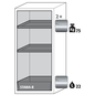 Veilige opslag, voldoet aan de geldende regelgeving voor gevaarlijke, ontvlambare producten in werkruimtes Robuust en duurzaam: Stevige constructie aan de buitenzijde van brandwerende platen met een coating van melaminehars 3 bevestigingsscharnieren per deur volledig sluitmechanisme en beveiligingselementen ter bescherming tegen corrosie, gemonteerd buiten de opslagruimte hoogwaardige deur, krasbestendig, met gestructureerd oppervlak met epoxy-coating Ergonomisch: de deur blijft in de stand staan bij het openen, automatische sluiting in geval van brand Gecontroleerd gebruik: vergrendelbare deur, compatibel met centrale vergrendeling Eenvoudig transport: geïntegreerde transportsokkel, eenvoudig afgewerkte plint of plint met 4 nivelleringsvoeten optioneel beschikbaar Beluchting en ontluchting: ingebouwd beluchtings- en ventilatiesysteem voor aansluiting (diameter 75 mm) op een technisch luchtafvoersysteem Getest en gecertificeerd conform de Amerikaanse norm FM 6050