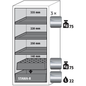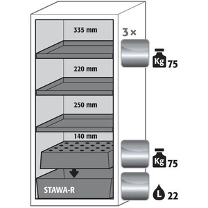 Veilige opslag, voldoet aan de geldende regelgeving voor gevaarlijke, ontvlambare producten in werkruimtes Robuust en duurzaam: Stevige constructie aan de buitenzijde van brandwerende platen met een coating van melaminehars 3 bevestigingsscharnieren per deur volledig sluitmechanisme en beveiligingselementen ter bescherming tegen corrosie, gemonteerd buiten de opslagruimte hoogwaardige deur, krasbestendig, met gestructureerd oppervlak met epoxy-coating Ergonomisch: de deur blijft in de stand staan bij het openen, automatische sluiting in geval van brand Gecontroleerd gebruik: vergrendelbare deur, compatibel met centrale vergrendeling Eenvoudig transport: geïntegreerde transportsokkel, eenvoudig afgewerkte plint of plint met 4 nivelleringsvoeten optioneel beschikbaar Beluchting en ontluchting: ingebouwd beluchtings- en ventilatiesysteem voor aansluiting (diameter 75 mm) op een technisch luchtafvoersysteem Getest en gecertificeerd conform de Amerikaanse norm FM 6050