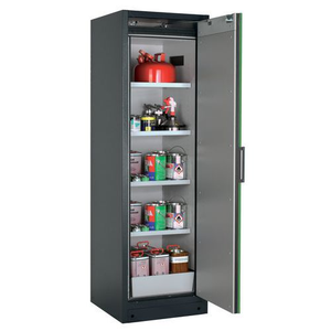 Veiligheidskast Q-PEGASUS-90 Q90.195.060 grijs/groen_Asecos, Totale hoogte: 1953 mm, Totale breedte: 599 mm, Totale hoogte (Reeks): Hoog (1500 - 2300 mm), Totale breedte (Reeks): 500 - 800 mm, Aantal legborden: 4, Voor producten: Ontvlambare stoffen, Brandveilig: 90 min, Inhoud opvangbak: 22 L, Aantal vakken: 1, Model: 4x legbord, 1x rooster, 1x opvangbak op de vloer (plaatstaal met epoxy-coating), Aantal deuren: 1, Kleur ombouw: Antraciet, Kleur deur: Groen, Totale diepte: 615 mm, Nuttige breedte: 450 mm, Nuttige diepte: 522 mm, Nuttige hoogte: 1647 mm, Materiaal: Staal, Gewicht: 321.28 kg, RAL: 7016, Special Covid-19: nee