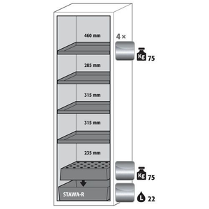 Veilige opslag, voldoet aan de geldende regelgeving voor gevaarlijke, ontvlambare producten in werkruimtes Robuust en duurzaam: Stevige constructie aan de buitenzijde van brandwerende platen met een coating van melaminehars 3 bevestigingsscharnieren per deur volledig sluitmechanisme en beveiligingselementen ter bescherming tegen corrosie, gemonteerd buiten de opslagruimte hoogwaardige deur, krasbestendig, met gestructureerd oppervlak met epoxy-coating Ergonomisch: de deur blijft in de stand staan bij het openen, automatische sluiting in geval van brand Gecontroleerd gebruik: vergrendelbare deur, compatibel met centrale vergrendeling Eenvoudig transport: geïntegreerde transportsokkel, eenvoudig afgewerkte plint of plint met 4 nivelleringsvoeten optioneel beschikbaar Beluchting en ontluchting: ingebouwd beluchtings- en ventilatiesysteem voor aansluiting (diameter 75 mm) op een technisch luchtafvoersysteem Getest en gecertificeerd conform de Amerikaanse norm FM 6050