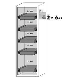 Veilige opslag, voldoet aan de geldende regelgeving voor gevaarlijke, ontvlambare producten in werkruimtes Robuust en duurzaam: Stevige constructie aan de buitenzijde van brandwerende platen met een coating van melaminehars 3 bevestigingsscharnieren per deur volledig sluitmechanisme en beveiligingselementen ter bescherming tegen corrosie, gemonteerd buiten de opslagruimte hoogwaardige deur, krasbestendig, met gestructureerd oppervlak met epoxy-coating Ergonomisch: de deur blijft in de stand staan bij het openen, automatische sluiting in geval van brand Gecontroleerd gebruik: vergrendelbare deur, compatibel met centrale vergrendeling Eenvoudig transport: geïntegreerde transportsokkel, eenvoudig afgewerkte plint of plint met 4 nivelleringsvoeten optioneel beschikbaar Beluchting en ontluchting: ingebouwd beluchtings- en ventilatiesysteem voor aansluiting (diameter 75 mm) op een technisch luchtafvoersysteem Getest en gecertificeerd conform de Amerikaanse norm FM 6050
