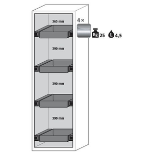 Veilige opslag, voldoet aan de geldende regelgeving voor gevaarlijke, ontvlambare producten in werkruimtes Robuust en duurzaam: Stevige constructie aan de buitenzijde van brandwerende platen met een coating van melaminehars 3 bevestigingsscharnieren per deur volledig sluitmechanisme en beveiligingselementen ter bescherming tegen corrosie, gemonteerd buiten de opslagruimte hoogwaardige deur, krasbestendig, met gestructureerd oppervlak met epoxy-coating Ergonomisch: de deur blijft in de stand staan bij het openen, automatische sluiting in geval van brand Gecontroleerd gebruik: vergrendelbare deur, compatibel met centrale vergrendeling Eenvoudig transport: geïntegreerde transportsokkel, eenvoudig afgewerkte plint of plint met 4 nivelleringsvoeten optioneel beschikbaar Beluchting en ontluchting: ingebouwd beluchtings- en ventilatiesysteem voor aansluiting (diameter 75 mm) op een technisch luchtafvoersysteem Getest en gecertificeerd conform de Amerikaanse norm FM 6050