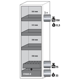 Veilige opslag, voldoet aan de geldende regelgeving voor gevaarlijke, ontvlambare producten in werkruimtes Robuust en duurzaam: Stevige constructie aan de buitenzijde van brandwerende platen met een coating van melaminehars 3 bevestigingsscharnieren per deur volledig sluitmechanisme en beveiligingselementen ter bescherming tegen corrosie, gemonteerd buiten de opslagruimte hoogwaardige deur, krasbestendig, met gestructureerd oppervlak met epoxy-coating Ergonomisch: de deur blijft in de stand staan bij het openen, automatische sluiting in geval van brand Gecontroleerd gebruik: vergrendelbare deur, compatibel met centrale vergrendeling Eenvoudig transport: geïntegreerde transportsokkel, eenvoudig afgewerkte plint of plint met 4 nivelleringsvoeten optioneel beschikbaar Beluchting en ontluchting: ingebouwd beluchtings- en ventilatiesysteem voor aansluiting (diameter 75 mm) op een technisch luchtafvoersysteem Getest en gecertificeerd conform de Amerikaanse norm FM 6050