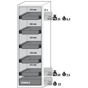 Veilige opslag, voldoet aan de geldende regelgeving voor gevaarlijke, ontvlambare producten in werkruimtes Robuust en duurzaam: Stevige constructie aan de buitenzijde van brandwerende platen met een coating van melaminehars 3 bevestigingsscharnieren per deur volledig sluitmechanisme en beveiligingselementen ter bescherming tegen corrosie, gemonteerd buiten de opslagruimte hoogwaardige deur, krasbestendig, met gestructureerd oppervlak met epoxy-coating Ergonomisch: de deur blijft in de stand staan bij het openen, automatische sluiting in geval van brand Gecontroleerd gebruik: vergrendelbare deur, compatibel met centrale vergrendeling Eenvoudig transport: geïntegreerde transportsokkel, eenvoudig afgewerkte plint of plint met 4 nivelleringsvoeten optioneel beschikbaar Beluchting en ontluchting: ingebouwd beluchtings- en ventilatiesysteem voor aansluiting (diameter 75 mm) op een technisch luchtafvoersysteem Getest en gecertificeerd conform de Amerikaanse norm FM 6050