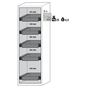 Veilige opslag, voldoet aan de geldende regelgeving voor gevaarlijke, ontvlambare producten in werkruimtes Robuust en duurzaam: Stevige constructie aan de buitenzijde van brandwerende platen met een coating van melaminehars 3 bevestigingsscharnieren per deur volledig sluitmechanisme en beveiligingselementen ter bescherming tegen corrosie, gemonteerd buiten de opslagruimte hoogwaardige deur, krasbestendig, met gestructureerd oppervlak met epoxy-coating Ergonomisch: de deur blijft in de stand staan bij het openen, automatische sluiting in geval van brand Gecontroleerd gebruik: vergrendelbare deur, compatibel met centrale vergrendeling Eenvoudig transport: geïntegreerde transportsokkel, eenvoudig afgewerkte plint of plint met 4 nivelleringsvoeten optioneel beschikbaar Beluchting en ontluchting: ingebouwd beluchtings- en ventilatiesysteem voor aansluiting (diameter 75 mm) op een technisch luchtafvoersysteem Getest en gecertificeerd conform de Amerikaanse norm FM 6050