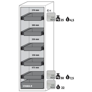 Veiligheidskast S-CLASSIC-90, Totale hoogte: 1968 mm, Totale breedte: 596 mm, Totale hoogte (Reeks): Hoog (1500 - 2300 mm), Totale breedte (Reeks): 500 - 800 mm, Aantal legborden: 0, Voor producten: Ontvlambare stoffen, Brandveilig: 90 min, Inhoud opvangbak: 22 L, Aantal vakken: 1, Model: 4x lade, 1x lade (afvoer), 1x opvangbak op de vloer (plaatstaal met epoxy-coating), Aantal deuren: 1, Kleur ombouw: Wit, Kleur deur: Wit, Totale diepte: 616 mm, Nuttige breedte: 450 m, Nuttige diepte: 524 mm, Nuttige hoogte: 1742 mm, Materiaal: Staal, Gewicht: 316.165 kg, RAL: 9016, Special Covid-19: nee