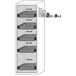 Veiligheidskast S-CLASSIC-90, Totale hoogte: 1968 mm, Totale breedte: 596 mm, Totale hoogte (Reeks): Hoog (1500 - 2300 mm), Totale breedte (Reeks): 500 - 800 mm, Aantal legborden: 0, Voor producten: Ontvlambare stoffen, Brandveilig: 90 min, Inhoud opvangbak: 0 L, Aantal vakken: 1, Model: 5x lade (plaatstaal met epoxy-coating), Aantal deuren: 1, Kleur ombouw: Wit, Kleur deur: Wit, Totale diepte: 616 mm, Nuttige breedte: 450 m, Nuttige diepte: 524 mm, Nuttige hoogte: 1742 mm, Gewicht: 308.165 kg, RAL: 9016, Special Covid-19: nee