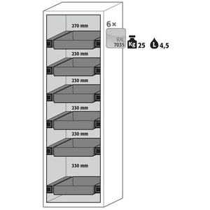 Veiligheidskast S-CLASSIC-90, Totale hoogte: 1968 mm, Totale breedte: 596 mm, Totale hoogte (Reeks): Hoog (1500 - 2300 mm), Totale breedte (Reeks): 500 - 800 mm, Aantal legborden: 0, Voor producten: Ontvlambare stoffen, Brandveilig: 90 min, Inhoud opvangbak: 0 L, Aantal vakken: 1, Model: 6x lade (plaatstaal met epoxy-coating), Aantal deuren: 1, Kleur ombouw: Wit, Kleur deur: Wit, Totale diepte: 616 mm, Nuttige breedte: 450 m, Nuttige diepte: 524 mm, Nuttige hoogte: 1742 mm, Gewicht: 315.165 kg, RAL: 9016, Special Covid-19: nee