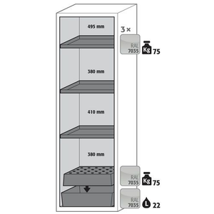 Veilige opslag van ontvlambare gevaarlijke stoffen in werkruimtes conform de wettelijke voorschriften, Functie - constructie: Robuust en duurzaam: stabiele buitenbehuizing van gepoedercoat fijn plaatstaal, 3-voudige deurophanging, volledig sluitmechaniek en veiligheidselementen ter bescherming tegen corrosie buiten de opslagruimte gemonteerd, Ruimtebesparende vouwdeur: kleine benodigde ruimte voor de kast bij geopende deur, Betrouwbaar en veilig: de deur klikt vast in de standaard gemonteerde deurvastzetinrichting voor het veilig plaatsen en uitnemen van emballage, Geen toegang voor onbevoegden: deur afsluitbaar met profielcilinder (geschikt voor centraal deursluitsysteem), Gemakkelijk te plaatsen: stelvoeten voor het compenseren van kleinere oneffenheden in de vloer (tot 10 mm), Be- en ontluchting: geïntegreerd beluchtings- en ventilatiesysteem voor aansluiting (NW 75) op een mechanische afzuiginstallatie Let op: voor de technische ventilatie van de kast adviseren wij de ventilatiebox met geïntegreerde filtratie (zonder gaten in de muren te boren of afvoerleidingen naar buiten).