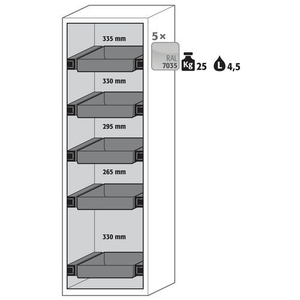 Brandveiligheidsopslagkast S-PHOENIX-90-S90.196.060, Totale hoogte: 1968 mm, Totale breedte: 596 mm, Totale hoogte (Reeks): Hoog (1500 - 2300 mm), Totale breedte (Reeks): 500 - 800 mm, Aantal legborden: 3, Voor producten: Ontvlambare stoffen, Brandveilig: 90 min, Inhoud opvangbak: 33 L, Aantal vakken: 1, Model: S90.196.060.FDAC, Aantal deuren: 1, Kleur ombouw: Lichtgrijs, Kleur deur: Lichtgrijs, Totale diepte: 616 mm, Nuttige breedte: 450 mm, Nuttige diepte: 524 mm, Nuttige hoogte: 1742 mm, Max. belasting: 600 kg, Materiaal: Staal, Gewicht: 260 kg, RAL: 7035, Special Covid-19: nee, CLP - Ontvlambare stoffen: ja