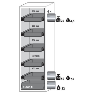 Veilige opslag van ontvlambare gevaarlijke stoffen in werkruimtes conform de wettelijke voorschriften, Functie - constructie: Robuust en duurzaam: stabiele buitenbehuizing van gepoedercoat fijn plaatstaal, 3-voudige deurophanging, volledig sluitmechaniek en veiligheidselementen ter bescherming tegen corrosie buiten de opslagruimte gemonteerd, Ruimtebesparende vouwdeur: kleine benodigde ruimte voor de kast bij geopende deur, Betrouwbaar en veilig: de deur klikt vast in de standaard gemonteerde deurvastzetinrichting voor het veilig plaatsen en uitnemen van emballage, Geen toegang voor onbevoegden: deur afsluitbaar met profielcilinder (geschikt voor centraal deursluitsysteem), Gemakkelijk te plaatsen: stelvoeten voor het compenseren van kleinere oneffenheden in de vloer (tot 10 mm), Be- en ontluchting: geïntegreerd beluchtings- en ventilatiesysteem voor aansluiting (NW 75) op een mechanische afzuiginstallatie Let op: voor de technische ventilatie van de kast adviseren wij de ventilatiebox met geïntegreerde filtratie (zonder gaten in de muren te boren of afvoerleidingen naar buiten).