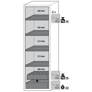 Veilige opslag van ontvlambare gevaarlijke stoffen in werkruimtes conform de wettelijke voorschriften, Functie - constructie: Robuust en duurzaam: stabiele buitenbehuizing van gepoedercoat fijn plaatstaal, 3-voudige deurophanging, volledig sluitmechaniek en veiligheidselementen ter bescherming tegen corrosie buiten de opslagruimte gemonteerd, Ruimtebesparende vouwdeur: kleine benodigde ruimte voor de kast bij geopende deur, Betrouwbaar en veilig: de deur klikt vast in de standaard gemonteerde deurvastzetinrichting voor het veilig plaatsen en uitnemen van emballage, Geen toegang voor onbevoegden: deur afsluitbaar met profielcilinder (geschikt voor centraal deursluitsysteem), Gemakkelijk te plaatsen: stelvoeten voor het compenseren van kleinere oneffenheden in de vloer (tot 10 mm), Be- en ontluchting: geïntegreerd beluchtings- en ventilatiesysteem voor aansluiting (NW 75) op een mechanische afzuiginstallatie Let op: voor de technische ventilatie van de kast adviseren wij de ventilatiebox met geïntegreerde filtratie (zonder gaten in de muren te boren of afvoerleidingen naar buiten).