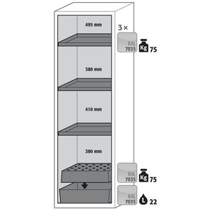 Brandveiligheidsopslagkast S-PHOENIX-90-S90.196.060, Totale hoogte: 1968 mm, Totale breedte: 596 mm, Totale hoogte (Reeks): Hoog (1500 - 2300 mm), Totale breedte (Reeks): 500 - 800 mm, Aantal legborden: 0, Voor producten: Ontvlambare stoffen, Brandveilig: 90 min, Inhoud opvangbak: 22 L, Aantal vakken: 1, Model: S90.196.060.075.FDASR, Aantal deuren: 1, Kleur ombouw: Lichtgrijs, Kleur deur: Lichtgrijs, Totale diepte: 749 mm, Nuttige breedte: 450 mm, Nuttige diepte: 657 mm, Nuttige hoogte: 1742 mm, Max. belasting: 600 kg, Materiaal: Staal, Gewicht: 310 kg, RAL: 7035, Special Covid-19: nee, CLP - Ontvlambare stoffen: ja