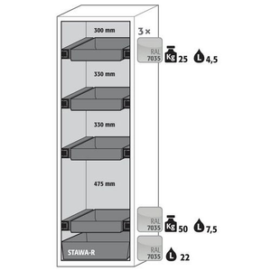 Veiligheidskast S-PHOENIX Vol. 2-90 S90.196.060_Asecos, Totale hoogte: 1968 mm, Totale breedte: 596 mm, Totale hoogte (Reeks): Hoog (1500 - 2300 mm), Totale breedte (Reeks): 500 - 800 mm, Aantal legborden: 0, Voor producten: Ontvlambare stoffen, Brandveilig: 90 min, Inhoud opvangbak: 22 L, Aantal vakken: 1, Model: 3x lade, 1x lade (afvoer), 1x opvangbak op de vloer (plaatstaal met epoxy-coating), Aantal deuren: 1, Kleur ombouw: Lichtgrijs, Kleur deur: Lichtgrijs, Totale diepte: 616 mm, Nuttige breedte: 450 mm, Nuttige diepte: 524 mm, Nuttige hoogte: 1742 mm, Materiaal: Staal, Gewicht: 317.665 kg, RAL: 7035, Special Covid-19: nee